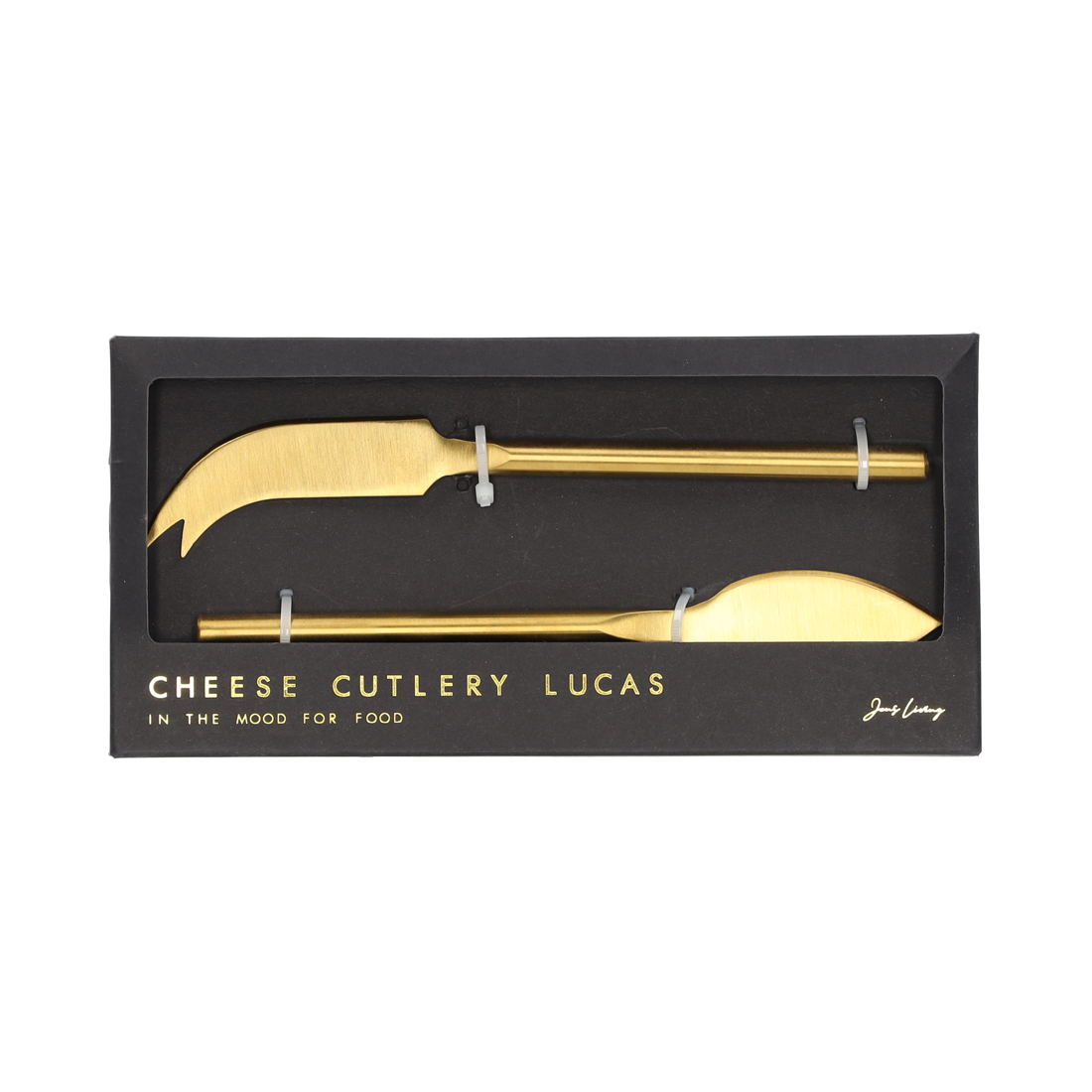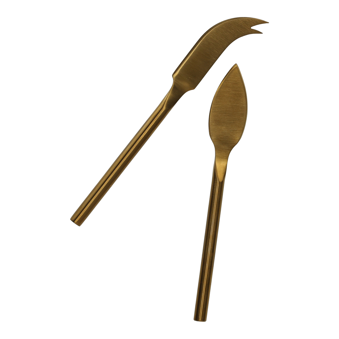 Deze set van twee kaasmesjes is de perfecte aanvulling op je keukenaccessoires. Met één mes voor harde kazen en één voor zachte kazen, snijd je moeiteloos door elk type kaas. De gouden kleur geeft de mesjes een luxe uitstraling, waardoor ze niet alleen praktisch zijn, maar ook een elegante touch toevoegen aan je kaasplank.